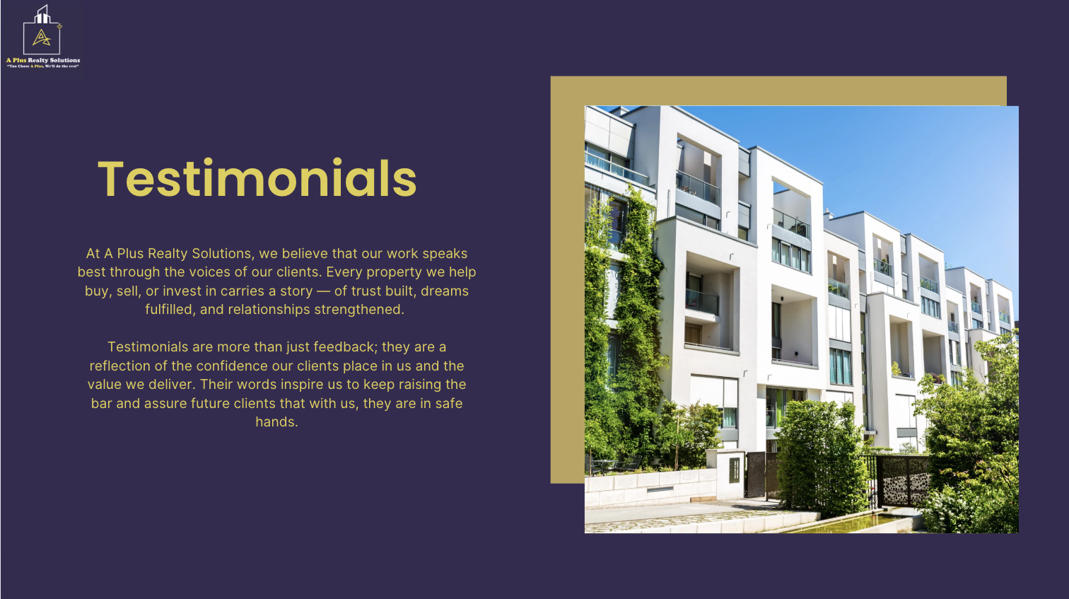 It was a wonderful experience with A Plus Realty Solutions while searching for a property in Lucknow. The team was extremely professional, transparent, and patient in understanding my requirements. They guided me through every step of the process, from shortlisting options to finalizing the deal, making everything smooth and stress-free. What I appreciated most was their honesty and the personal attention they gave, ensuring I found exactly what I was looking for. If you’re looking to buy or rent property in Lucknow, I would highly recommend A Plus Realty Solutions for their reliability and excellent service. "